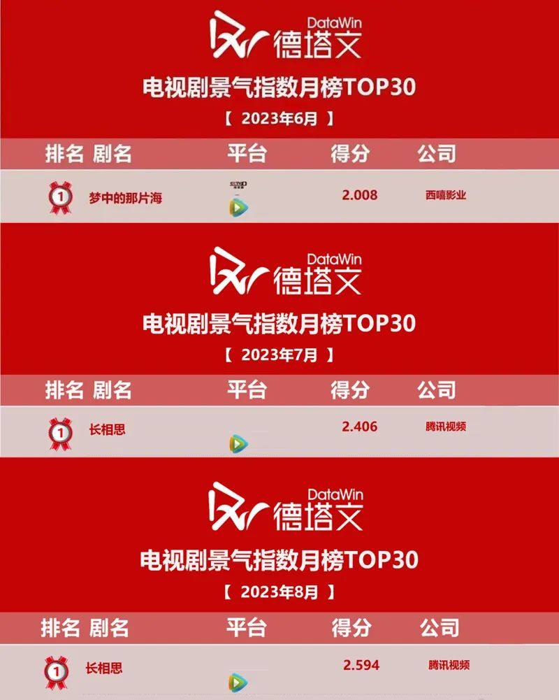 今年暑期档三个月,腾讯视频都有独播剧登顶德塔文月榜——6月冠军是《梦中的那片海》,7、8月冠军是《长相思 第一季》。