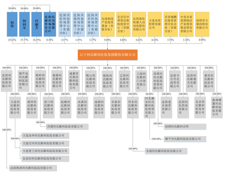 当然何氏眼科的控股方是何伟家族,其中何伟直接持股25.62%,妻子付丽芳直接持股6.48%,兄弟何向东直接持股15.37%,三人间接持股12.07%。因此何伟、何向东、付丽芳共同控制公司 63.31%股份,为公司控股股东和实际控制人。