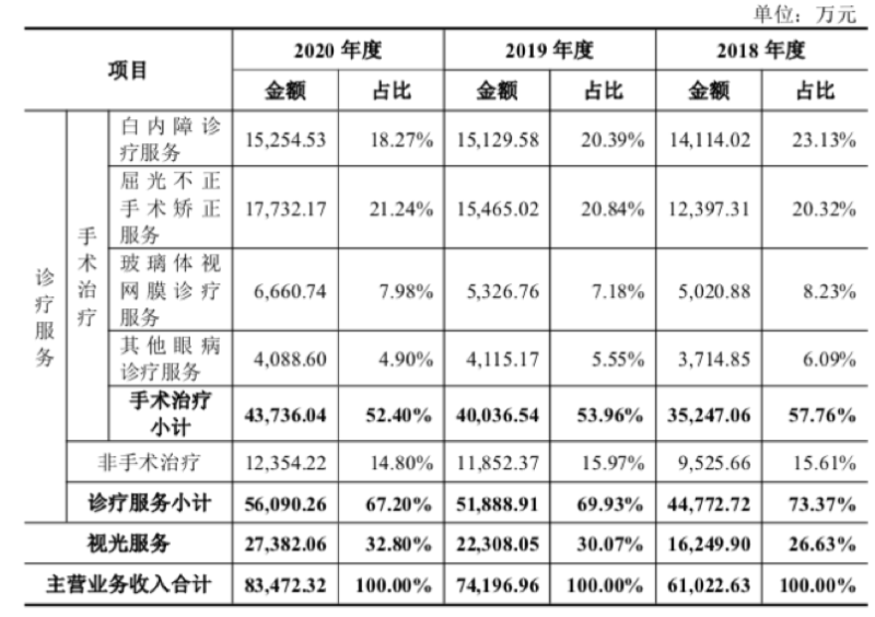 在这其中,公司的主营业务——诊疗服务的收入占比在逐年减少,从2018年的73.37%到2020年的67.2%;相反,视光服务的营收在增多,从2018年的26.63%到2020年的32.8%。