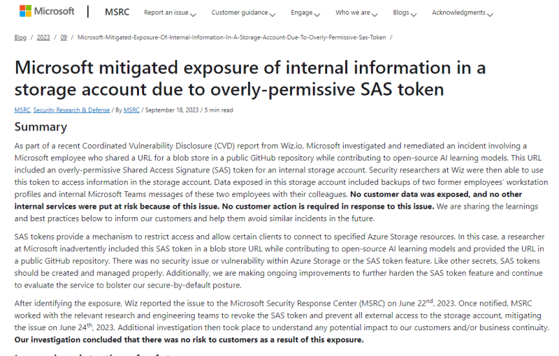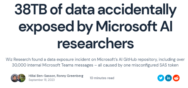 根据Wiz的一篇博客文章,微软的AI研究团队原本在GitHub上发布了开源训练数据,但由于SAS令牌的错误配置,其错误地配置为授予整个存储账户的权限,而且还授予用户完全控制权限——还不单单是只读权限,这意味着他们可以删除和覆盖现有文件。
