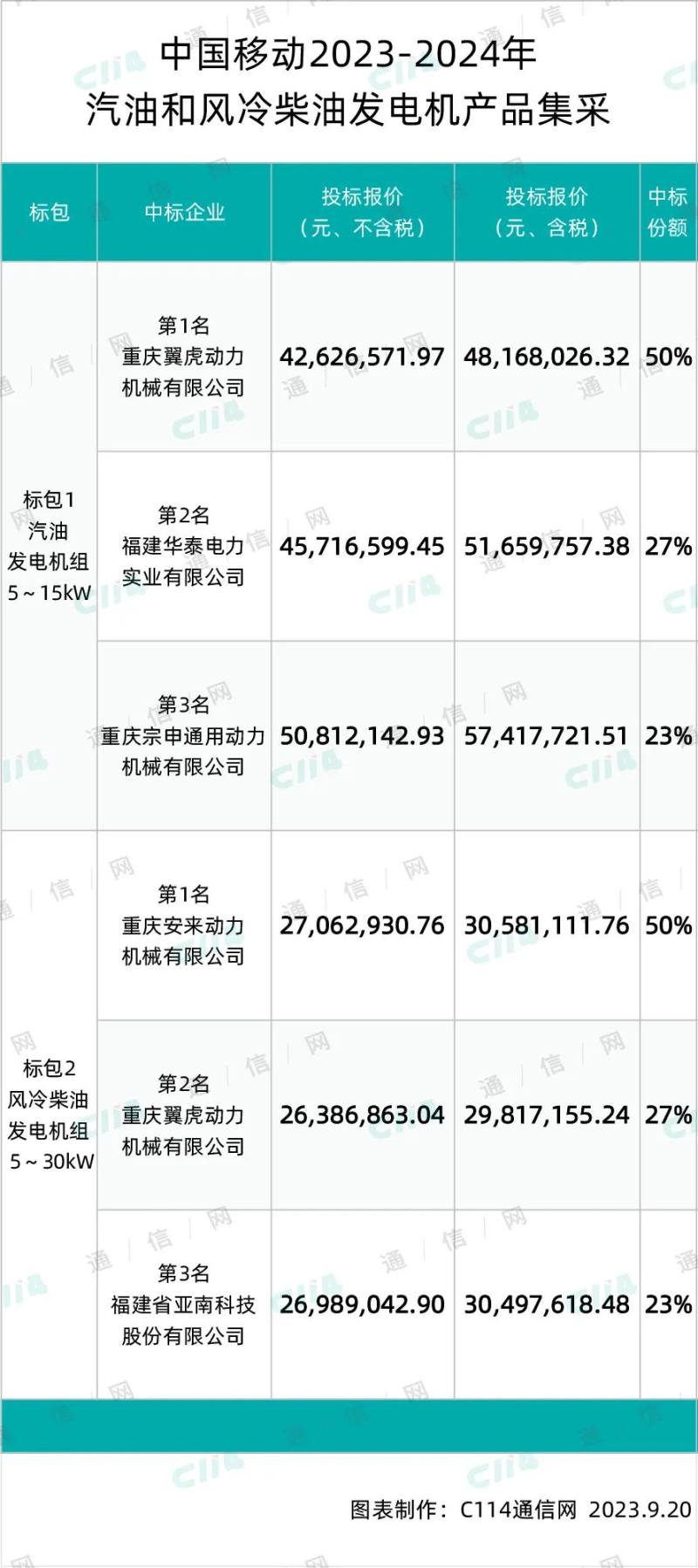 C114讯 9月20日消息(焦焦)从中国移动官网获悉,中国移动日前公示了2023年至2024年汽油和风冷柴油发电机产品的集采结果,翼虎、华泰、宗申、安来、亚南5家中标。