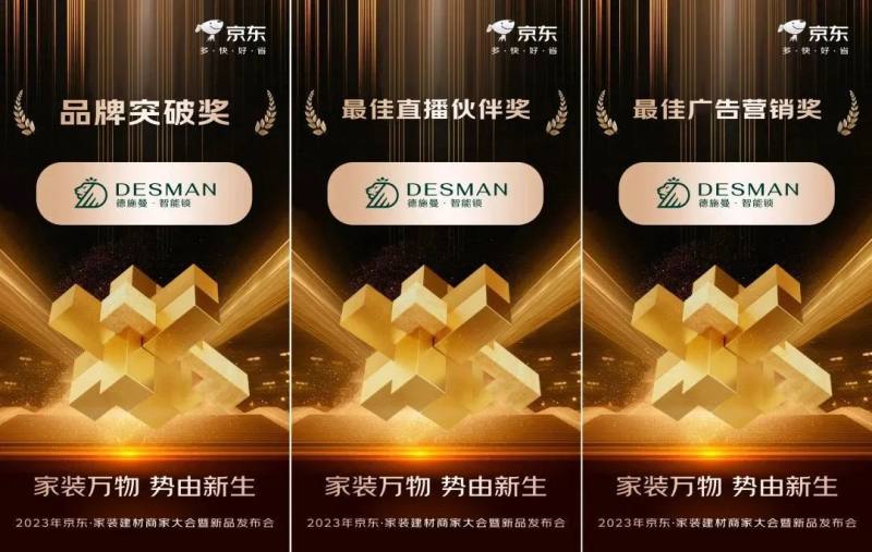 家装万物 势由新生!2023年京东家装建材商家大会暨新品战略发布会于近日隆重举行,现场邀请美的、九牧、松下、德施曼智能锁等行业头部品牌出席本次大会。其中,德施曼智能锁凭借强大的品牌实力,一举斩获“品牌突破奖”、“最佳广告营销奖”、“最佳直播伙伴奖”三大重磅奖项!