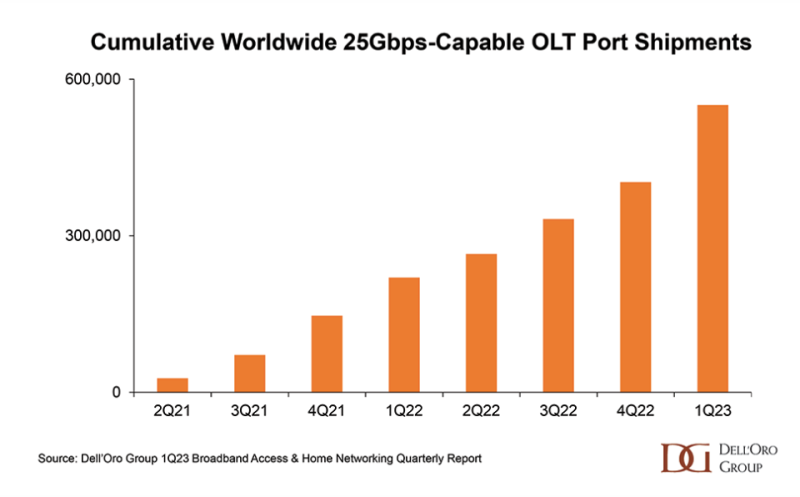截至2023年第一季度末,共有55万个支持25Gbps的OLT端口已交付市场,主要通过组合卡和光器件实现,这些组合卡和光器件可通过相同硬件并使用相同的ODN支持2.5Gbps GPON、XGS-PON和25GS-PON。如果我们假设运营商平均每个季度购买10万-20万个支持25Gbps的OLT端口,那么到2023年底,支持25Gbps的OLT端口出货量将超过100万。如果这种增长量保持下去,到2025年,服务提供商将购买超过200万个支持25Gbps的OLT端口。此外,我们假设这些端口总数中只有较低的个位数百分比用于提供企业服务。潜在的最终结果是大约有50万-70万个OLT端口用于企业、批发服务和移动传输服务当中。