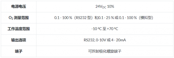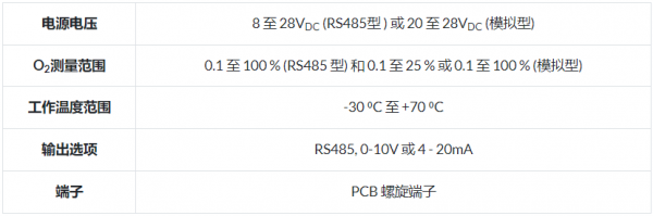 O2I-FLEX 具有外部触发的自动或手动校准功能。校准也可以通过板上的按钮开关启动。O2I-FLEX提供以下规格。
