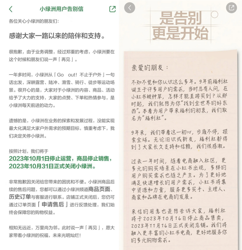 不到半个月内,小红书接连宣布关停电商平台小绿洲和自营店铺福利社。截至停止运营时间,小绿洲运营时间不足2年,福利社已持续运营近9年。