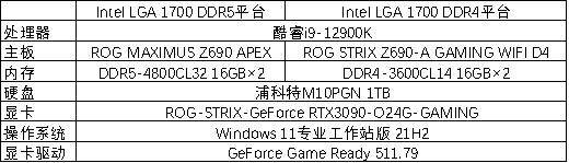 处理器选用了目前Alder Lake-S系列的旗舰产品酷睿i9-12900K,拥有8个P-Core+8个E-Core,最高睿频为5.2GHz,搭配RTX 3090显卡,以及最新版本的Windows 11操作系统。DDR5平台的主板是ROG MAXIMUS Z690 APEX,DDR4平台的主板则换成ROG STRIX Z690-A GAMING WIFI D4。