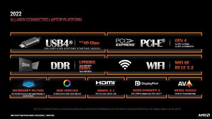 当然具体细节也有所区别,英特尔Alder Lake-H同时支持DDR5-4800、DDR4-3200、LPDDR5-5200、LPDDR4x-4266等广泛的内存类型,而AMD Rembrandt则更加激进,完全放弃了对DDR4和LPDDR4x内存的支持,只支持DDR5-4800或LPDDR5-6400两种内存形式。