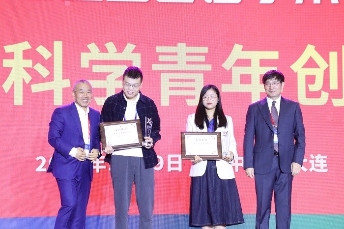 中国科学院大连化学物理研究所研究员张丽华宣布分离科学青年创新奖获奖名单,获奖人员为:南京师范大学徐铭、西南医科大学付琦峰。现场中国科学院大连化学物理研究所研究员许国旺、悟空仪器总经理刘文玉为他们颁奖。