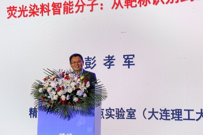 第四位进行报告的是中国科学院院士、大连理工大学教授彭孝军,他的报告题目为《荧光染料智能分子:从靶标识别到肿瘤诊疗》。彭孝军教授从“靶向性荧光成像染料”“癌症光/声动治疗靶向染”“智能响应医学诊疗染料未来”三个关注点展开,详细介绍了荧光染料的发光原理、基本结构、光谱性质、量子产率等内容,并针对其高灵敏度、高分辨率和高对比度的优点,以及目前国内相关领域存在的技术难题进行了细致的分析,对荧光染料智能分子的发展及应用进行了深入讲解。
