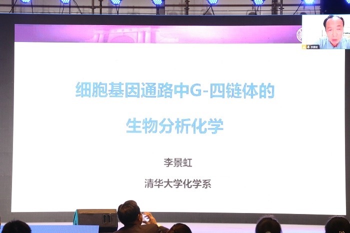 第三位进行报告的是中国科学院院士、清华大学教授李景虹,报告题为《细胞基因通路中G-四链体的生物分析化学》。由于李景虹院士因事不能亲临现场,本场报告以视频报告的方式进行。报告中他提到了G-4链体目前还有许多问题不清楚,所以需要发展新方法,并提供了一些研究思路。随后分享了“模块组装多功能探针法(mampa)”“活细胞内特定基因RNA G-四链体互做蛋白的高通量组学分析”“活细胞标记染色质G4”“猴痘病毒G4序列进化调控Kelch蛋白C9L表达”等研究成果。