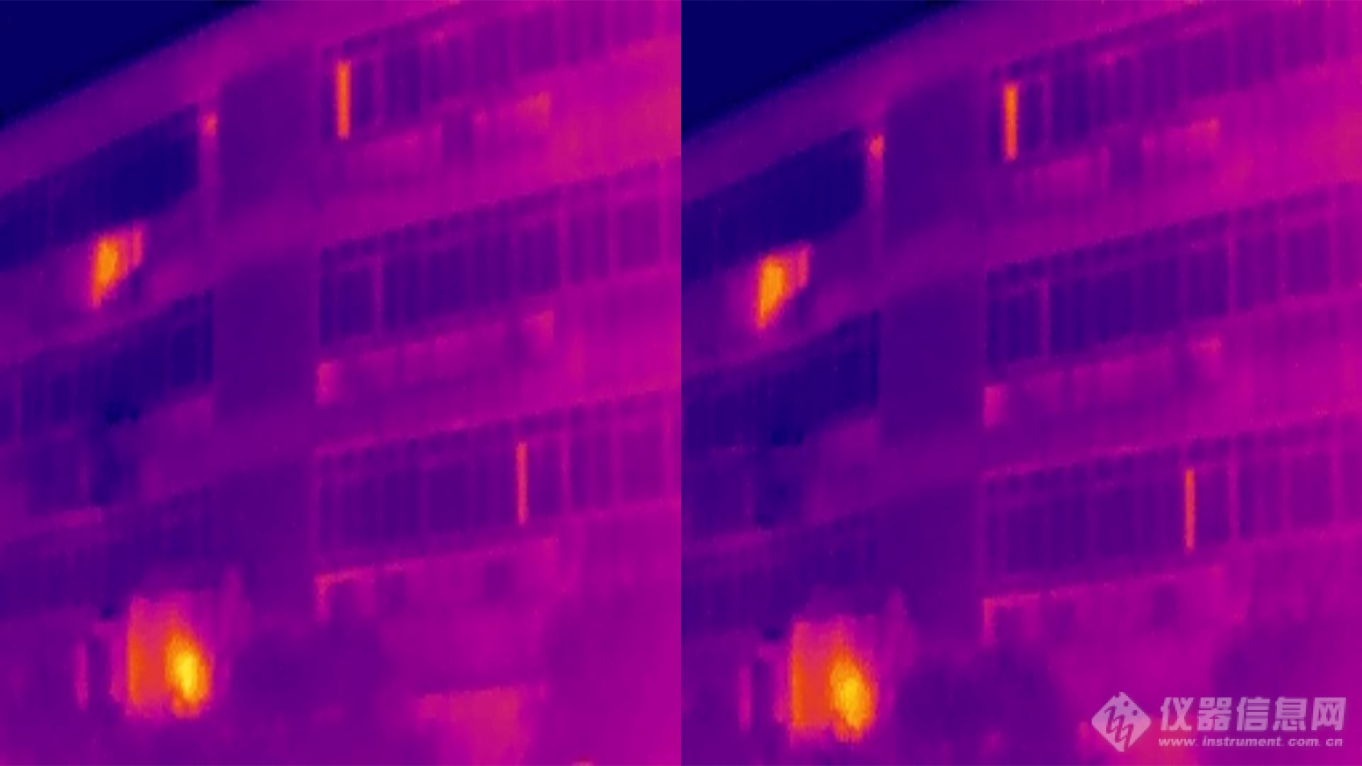 在进行多组热成像拍摄后,天色已晚,我们还想探究背后更多的物理原理。在22日光影秀正式公映第一天,我们特邀了物理与电子科学学院的夏冉同学一同在传播楼前拍摄观察。此前,我们在光影秀试投屏前后不同时刻拍摄了多张传院照片,但并没有见拍摄画面中有明显的变化。夏冉同学为我们解释,画面中两个热点分别是工作中的空调外机和投影仪,而打到传院外墙的灯光虽然有视觉震撼力,但相隔数十米的投映,并不能给墙体增热多少。