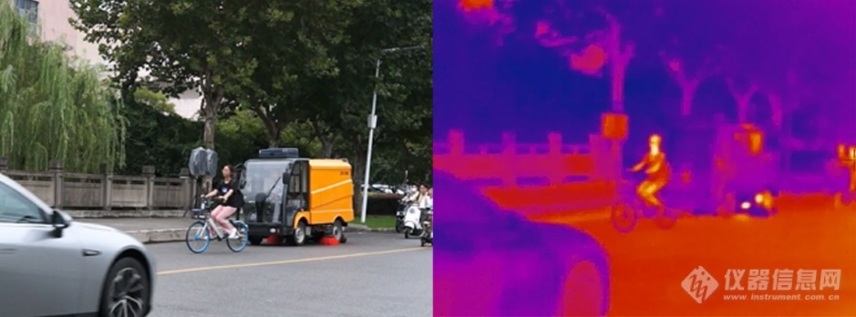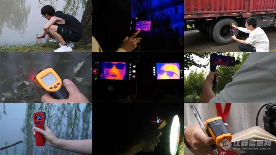 左侧的图片常见普通,而右侧的热成像对比图则是另一个光影世界。为了试验器材,拍摄一部校园热力学科普短片,我们将器材对准校园一角,果然是同一个场景不同的观感。红外热成像仪可以根据不同的场景,支持多种热图显示,包括多种伪彩色和热黑、热白模式;右图采用的成像模式就是伪彩色。类比摄像机镜头画面里明暗的对比,热成像视野的灰度差异表示热成像仪所接收物体发出红外线量的多少,即可反映物体的温差:颜色越深灰度越高说明相对温度越低,反之则越高;若要观察此时绝对温度还需要采用全画幅显示。镜头里,洒水车的扫帚旋转轴、后轮主轮轴温度最高,骑车的同学也呈现出高亮温感。试验成功,且让我们等待光影秀的搭建和开场吧。