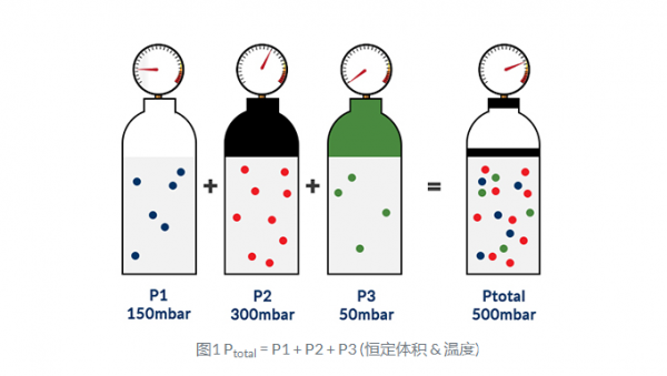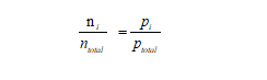 从等式 1 可以得出,单个气体组分的颗粒数 (ni) 与气体混合物的总颗粒数(ntotal) 之比等于单个气体组分的分压 (Pi) 与气体混合物的总压 (Ptotal) 之比。