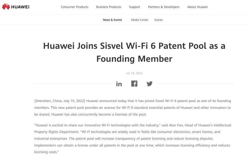 华为官网信息,在2022年7月19日,华为宣布加入Sisvel Wi-Fi 6专利池,成为其创始成员之一。这个新的专利池为华为和其他创新者的Wi-Fi6标准必要专利提供了共享的途径。华为也同时成为该池的被许可方。