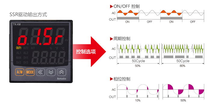 用户可选择SSR驱动输出中的标准ON/OFF 控制, 周期控制和相位控制,实现经济理想的温度控制。
