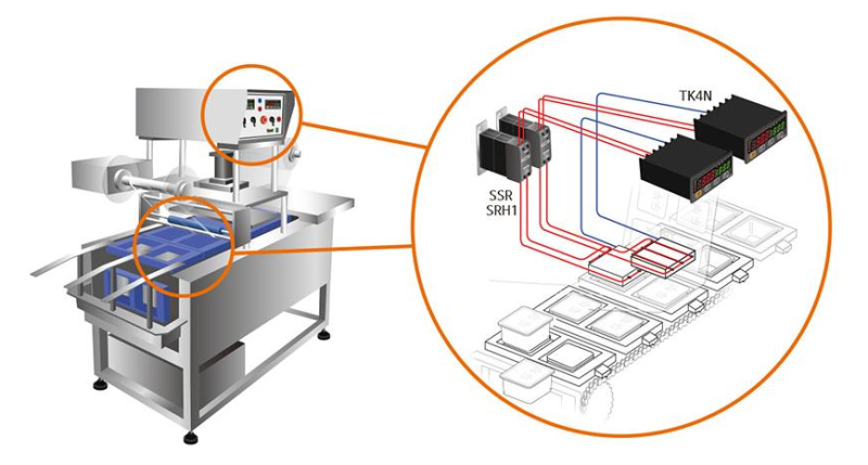 温度控制器和固态继电器用于控制食品容器封口机的温度。