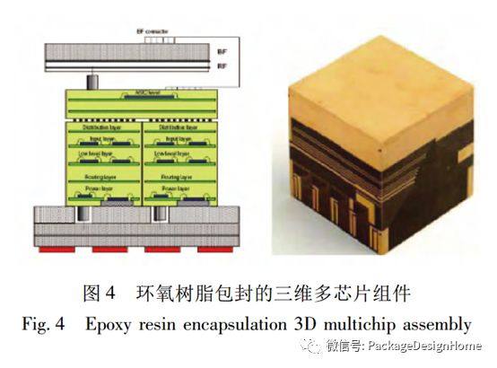 图4展示了一种环氧树脂包封的垂直互联电路结构示意图和实物。加工时将立体堆叠的二维MCM用环氧树脂进行包封,环氧树脂既是密封材料,也是堆叠芯片的空间支撑物,同时作为MCM的绝缘介质。