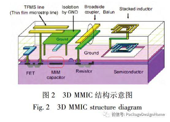 经过几十年的发展,3DMMIC技术已从单个器件向集成收发于一体的多功能芯片发展,把多片、多级放大器集成于一个芯片,提高单片性能的同时,缩小了设计和制造的结构空间。例如,TRIQ公司的Ka频段低噪声放大器TGA4507(1.86mm×0.85mm×0.1mm),其一只芯片内部集成了三级放大器,增益达到22dB。3DMMIC主要结构如图2所示。