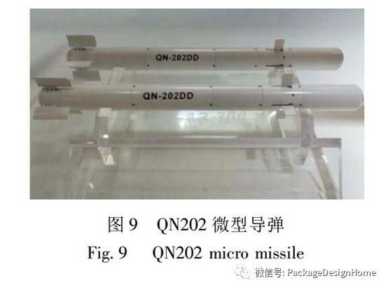 QN-202微型导弹由中国高德红外有限公司研制,2018年珠海航空航天展展出,长度只有60cm,弹口直径有6~8cm,射程为2km,重约1.2kg,采用红外成像制导系统,能自动搜索和跟踪目标,实现“发射后不管”。这个单兵便携式导弹发射系统由一个7.5kg的背包和导弹发射器组成,背包一般可以装载6枚导弹,见图9。