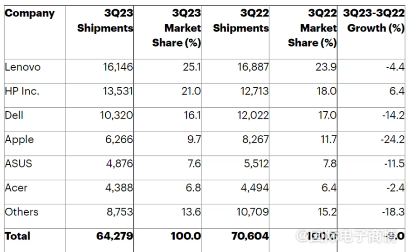 据Gartner公司的初步统计结果,2023年第三季度全球个人电脑出货量总计6430万台,较2022年第三季度下降9%。而第三季度的结果标志着全球个人电脑连续第八个季度下滑Gartner 预计,从今年第四季度开始,市场将再次出现增长。