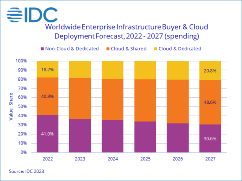 本季度,共享云基础设施的支出达到179亿美元,与去年同期相比增长了13.7%。2023年上半年,共享云基础设施类别的支出已超过非云支出,占基础设施总支出的45.8%。专用云基础设施领域在2023年第二季度同比下降了4.9%,降至67亿美元。本季度,在专用云基础设施总额中,43.9%部署在客户场所。