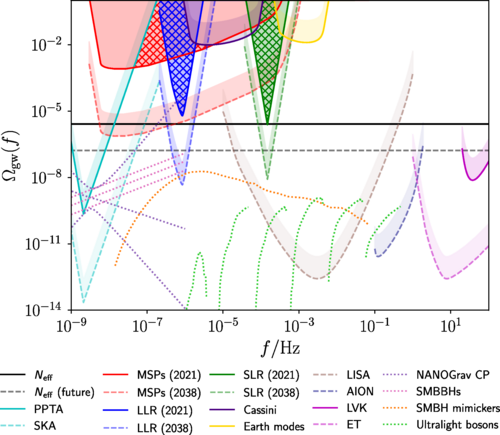 同样地,他们还提议利用宇宙中其他双星系统可能提供的信息作为引力波探测器。这就是分布在整个银河系的脉冲星双星系统的情况,在这些系统中,脉冲星的辐射束能够以令人难以置信的精度(精度为百万分之一)获得这些恒星的轨道。鉴于这些轨道大约持续20天,微赫兹频率范围内的引力波的通过对它们的影响特别大。Blas和 Jenkins得出结论,这些系统也可以成为这些类型引力波的潜在探测器。