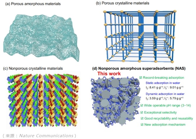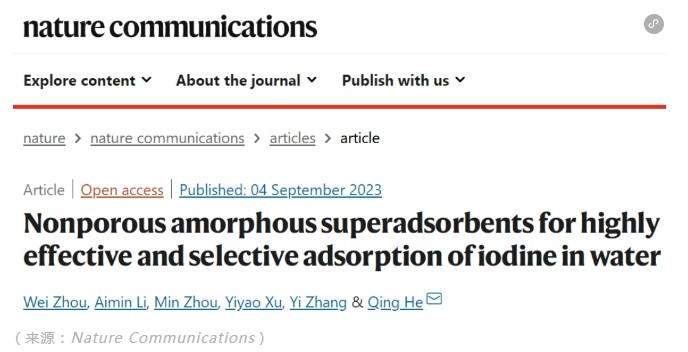 最终,相关论文以《高效选择性吸附水中碘的非多孔非晶态超级吸附剂》(Nonporous amorphous superadsorbents for highly effective and selective adsorption of iodine in water)为题发在 Nature Communications[1],博士生周维是第一作者,何清担任独立通讯作者。