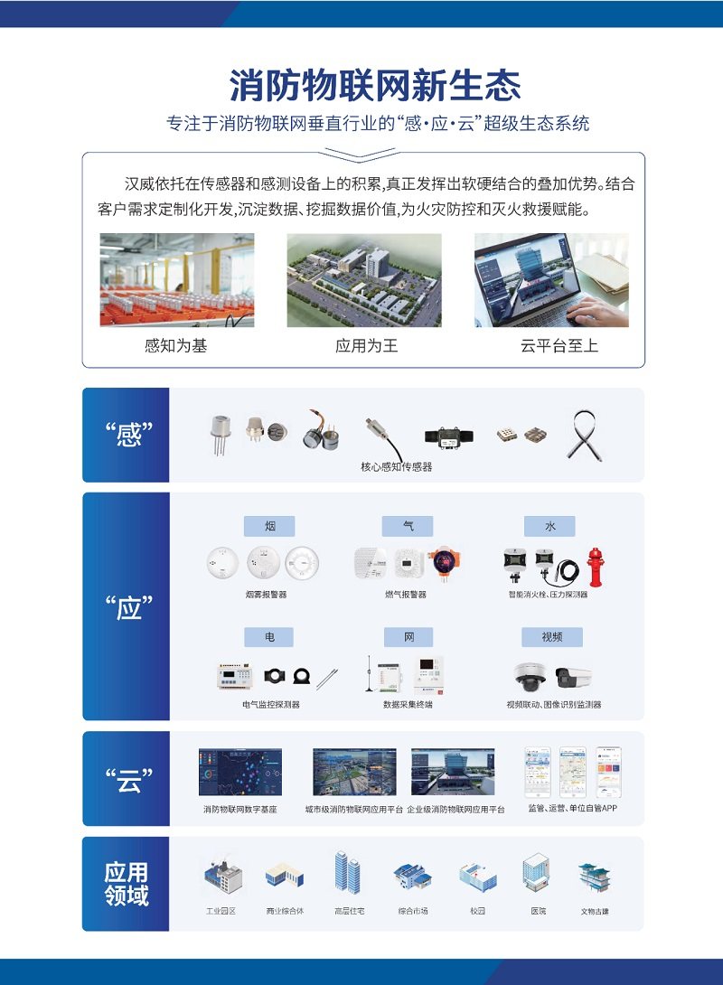 汉威科技集团基于各类高性能底层感知元件、智能探测设备,以及物联网、大数据等技术推出了多系列智慧化消防安全解决方案,可动态捕捉烟雾、火焰、可燃气体、液位、压力、消防设备、人员等信息,并进行实时可视化监测监管,一旦出现险情,及时进行现场报警、联动报警,可实现对各社会单位消防情况的全面掌握,进而全面提高社会预防火灾、抵御火灾的能力。