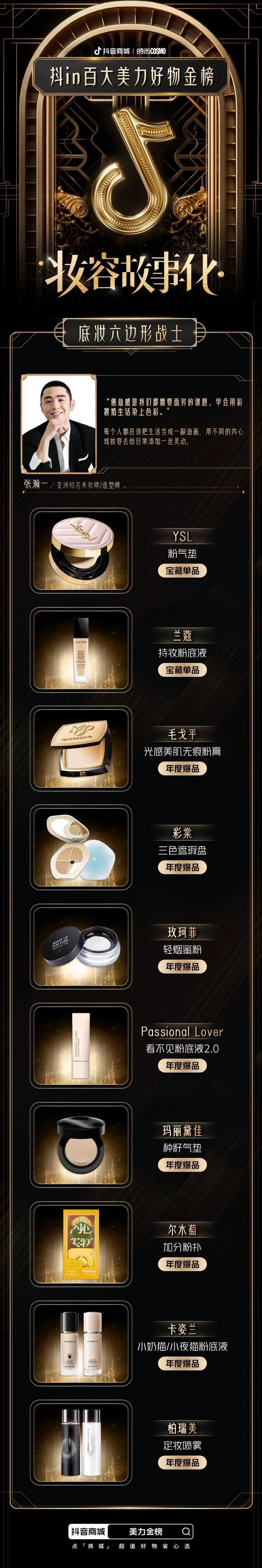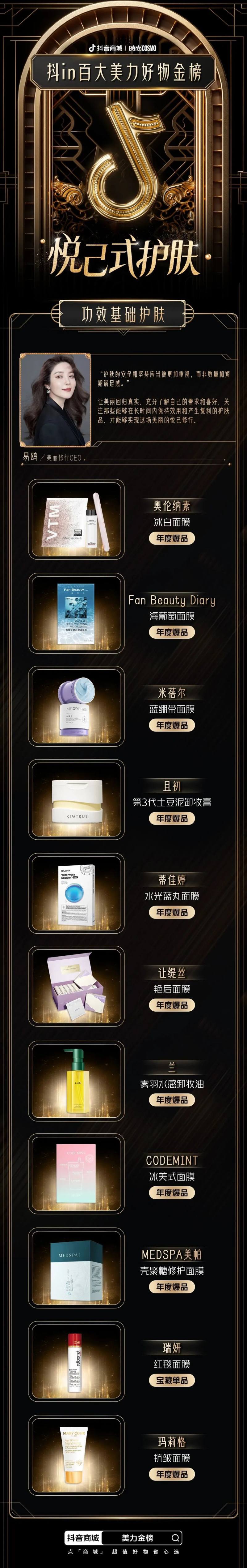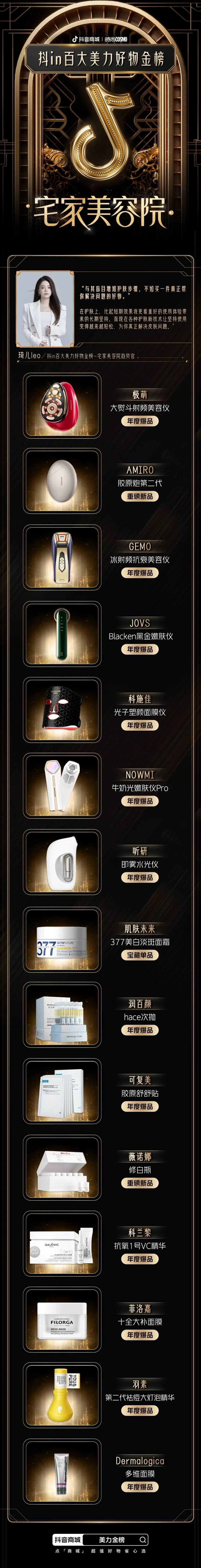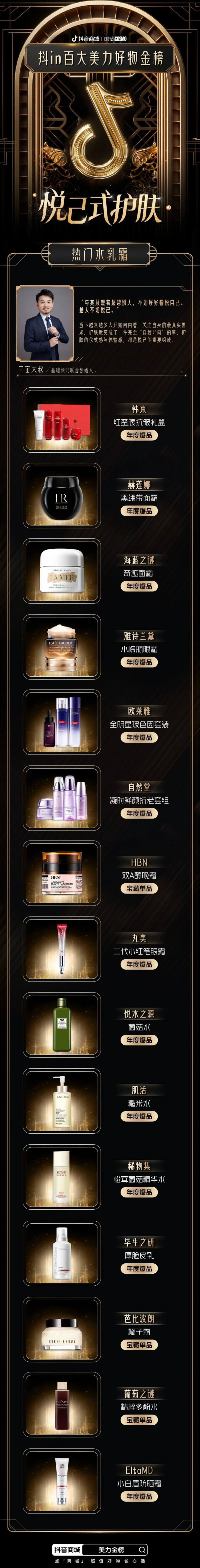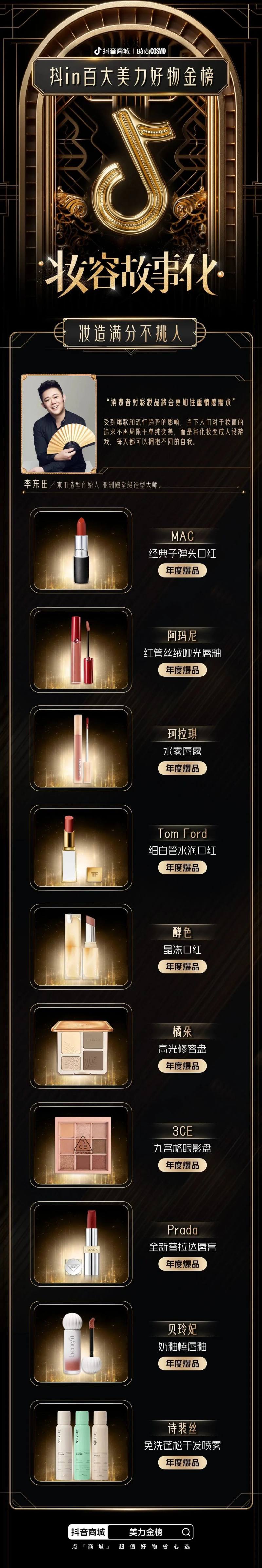 为了给消费者带来更便捷、有价值、有温度的购物体验,抖音电商美奢生活行业联合时尚COSMO,邀请美妆达人、行业专家和第三方机构等,从美妆行业“悦己式护肤”、“妆容故事化”、“五感式穿香”、“宅家美容院”、“精致护理”五大消费趋势进行评选,重磅推出「抖in百大美力好物金榜」。在满足消费者对“美力”生活追求的同时,让更多优秀的美妆个护产品被看见,促进美妆行业的良性发展。