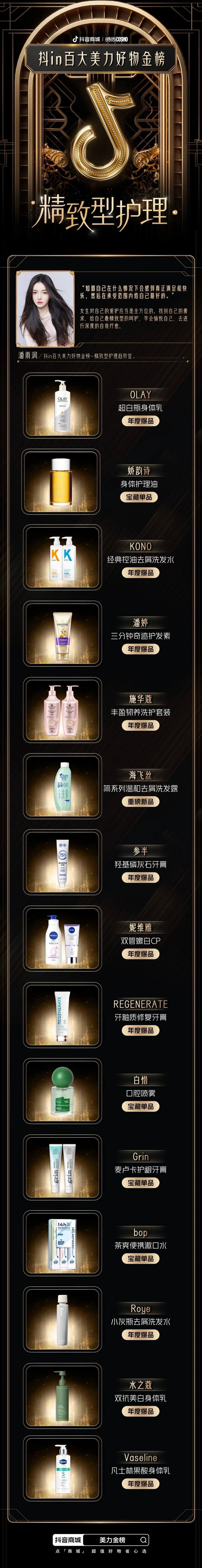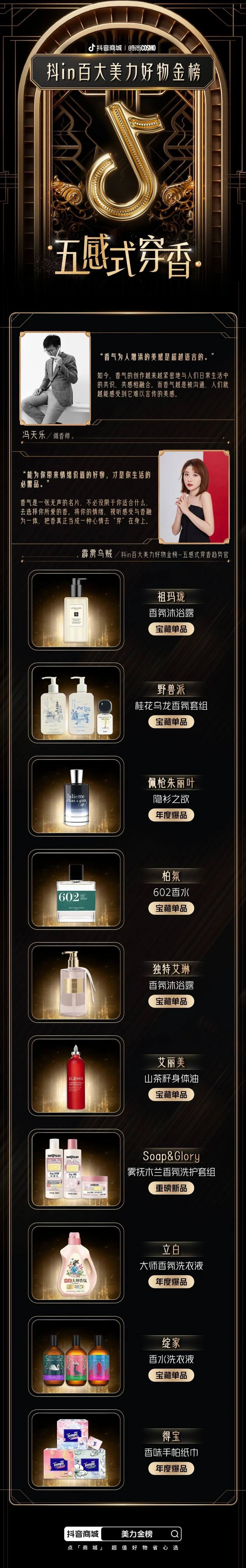 此外,金榜评审团还发现,从头皮护理、口腔护理到用香气打造氛围感、传递情绪和态度,当下消费者对自身的呵护、对变美的需求更加全面;因此「精致型护理」和「五感式穿香」也成为今年抖in百大美力好物金榜的趋势赛道。