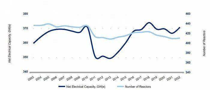 据国际原子能机构(IAEA)数据,全球核电装机容量在2011年同比下滑5.5%至351 GW,但从2014年开始逐步回升,到2018年达到374 GW,超越了2010年的371 GW,之后有所回落,到2022年全球核电装机容量再次增加,截至年末约为371 GW。