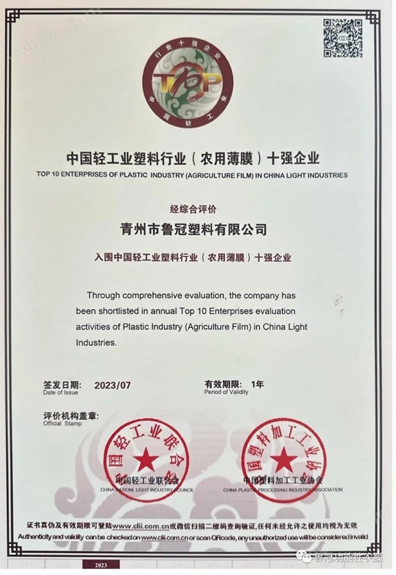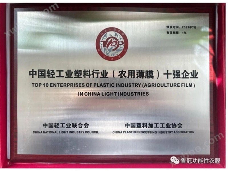 鲁冠农膜在众多竞争者中脱颖而出,连续三年荣获中国轻工业塑料行业(农用薄膜)十强企业称号。这一荣誉不仅是对我们企业实力的肯定,更是对我们产品质量的最高赞誉。