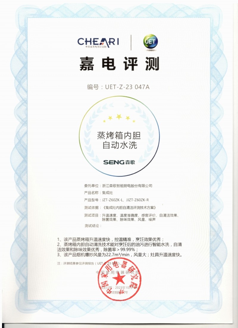 森歌Z60智能水洗集成灶的重磅发布,获得了行业高度认可。通过中国家用电器研究院《集成灶内胆自清洁评测技术方案》的相关测评,发现森歌Z60智能水洗集成灶蒸烤箱升温速度快,控温精准,烹饪效果优秀;蒸烤箱内胆自动清洗技术的自清洁和除味效果优秀,除菌率>99.99%;烟机爆炒风量22.7m³/min,风量大;灶具升温速度快。