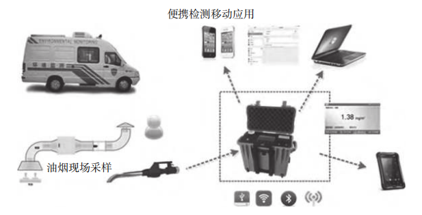 图5为巡检监测方案示意图。该巡检监测方案是指环保执法人员携带便携式餐饮油烟浓度检测仪,不定期对餐饮企业进行抽检。这种便携式餐饮油烟浓度检测仪包括油烟采样器与红外分光光度法油烟快速检测装置。采样分析过程可自动进行,较短时间内即可完成一个测量周期,并且可以灵活接入移动终端,通过APP软件实现现场执法测量、管理及与管理平台的数据共享,也可以直接接入管理平台与在线监测系统进行配套使用,为油烟现场快速执法检测提供了解决方案。