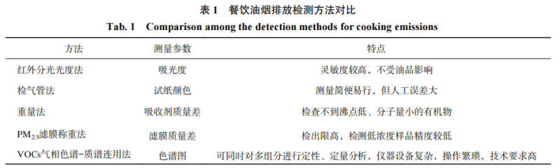 表1给出了餐饮油烟排放检测方法的对比。
