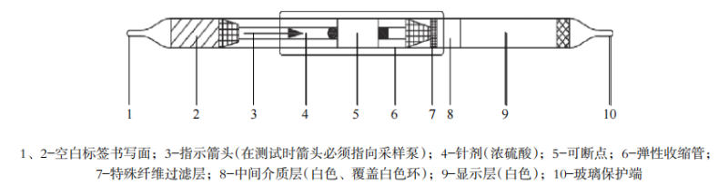 图2为检气管法装置结构示意图。利用采样泵把油烟采集至检气管内,并将其固定在过滤层面,在此油烟通过催化剂作用与浓硫酸发生分解反应,产生深色反应物。通过目测此反应物颜色的深浅,可定性判别油烟浓度超达标情况。