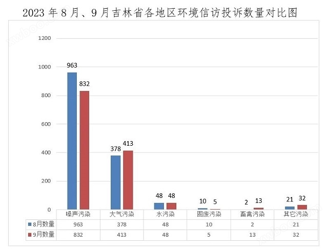 9月份,全省生态环境部门接到1330件生态环境问题信访投诉,同比增长14.56%,环比下降5.41%,其中已办结1257件,办结率约为94.51%。从污染类型分类情况来看,噪声污染问题832件,占总数的61.95%(其中工业噪声110件、建设施工噪声110件、社会生活娱乐噪声612件,分别占比13.22%、13.22%、73.56%);大气污染问题413件,占总数的30.75%;水污染问题48件,占总数的3.57%;固废污染问题5件,占总数的0.3%;畜禽粪污问题13件,占总数的0.9%;其它污染问题32件,占总数的2.53%。