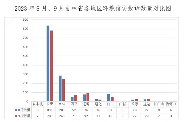 9月份,生态环境问题信访投诉办理量排名前两位的地区为长春和吉林地区,长春地区780件,占58.65%;吉林地区248件,占18.65%。长春地区突出的环境污染问题为噪声污染问题,共586件,占地区总数的75.13%,其中工业噪声62件、社会生活娱乐噪声524件,分别占比10.58%、89.42%。