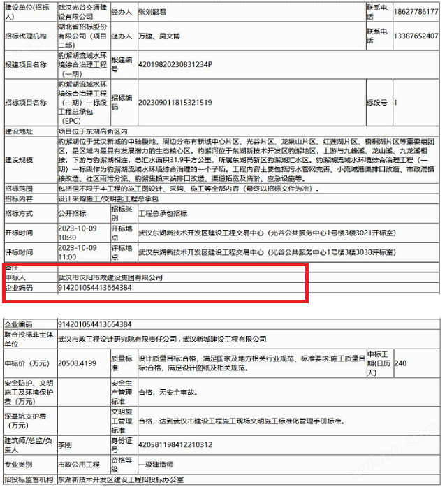 10月18日,武汉市豹澥湖流域水环境综合治理工程(一期)一标段工程总承包(EPC)中标结果公布,中标人为武汉市汉阳市政建设集团有限公司,中标价20508.4199万元。