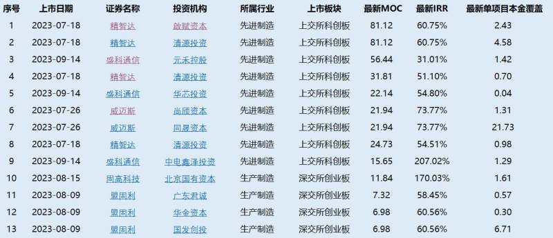 投中盛科通信的元禾控股,在此笔投资上MOC达到56倍,华芯投资为22倍,另一产业基金中电鑫投资为15.65倍。投资威迈斯的同晟资本、丰图投资、尚颀资本MOC也较为出色,分别是21倍、33倍和21倍。