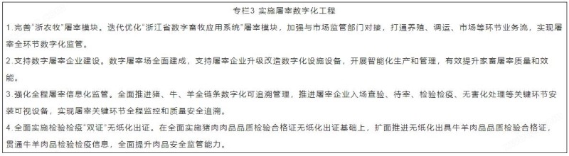 (六)深化屠宰数字化建设。推进屠宰企业数字化建设,依托浙江省数字畜牧应用系统,全面推进入场查验、待宰、检验检疫、无害化处理等全程信息化监管,实现畜产品质量安全可追溯。鼓励家畜定点屠宰企业配套建设数字化、可视化设施设备,开展智能化生产和管理,有效提升家畜屠宰质量和效能。应用数字化技术和设备,全面实现猪牛羊肉全链条数字化可追溯管理。