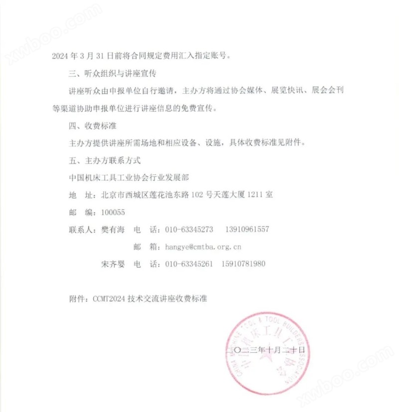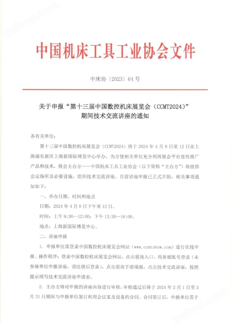 第十三届中国数控机床展览会(CCMT2024)将于2024年4月8-12日在上海浦东新区上海新国际博览中心举办,为方便相关单位充分利用展会平台宣传推广产品和技术,展会主办方——中国机床工具工业协会(以下简称“主办方”)将提供会议场所及必要设施,组织技术交流讲座。