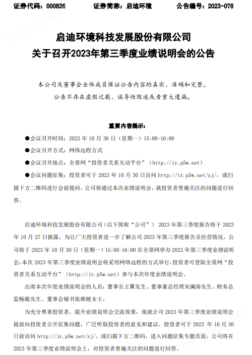 近日,启迪环境科技发展股份有限公司发布《关于召开2023年第三季度业绩说明会的公告》,明确,公司将于2023年10月30日(星期一)15:00-16:00以网络远程方式召开2023年第三季度业绩说明会。本次出席年度业绩说明会的人员:董事长王翼先生、董事兼总经理宋澜涛先生、财务总 监畅敞先生、董事会秘书张维娅女士。