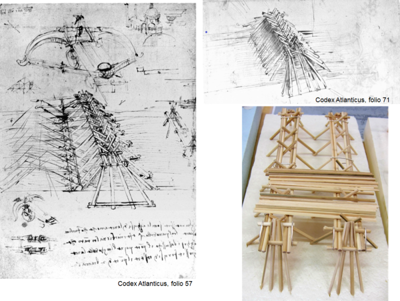 达芬奇对恺撒莱茵桥编木机制的推敲(图片来自刘妍“有方”讲座)