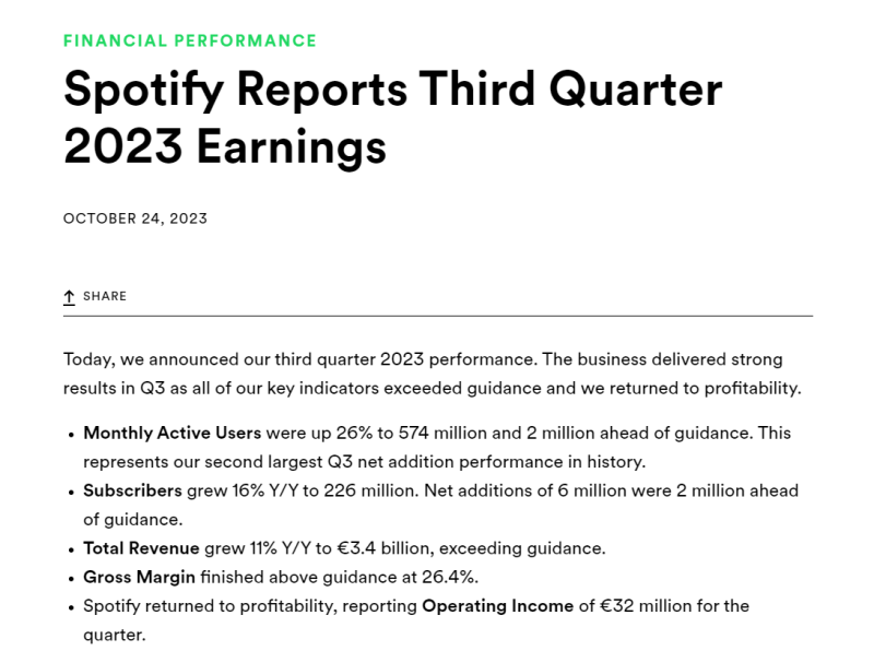 IT之家 10 月 24 日消息,Spotify 公布了 2023 年第三季度业绩,营业收入为 3200 万欧元(IT之家备注:当前约 2.49 亿元人民币),这是自 2021 年以来首次实现季度盈利,得益于较高的毛利率以及较低的营销和人员成本。