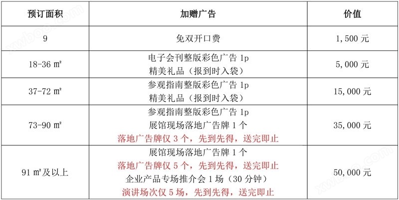 活动期限内预订展位并支付订金,企业享受展位85折优惠,同时根据企业预订的展位面积大小(不接受企业拼展位)赠送广告项目。