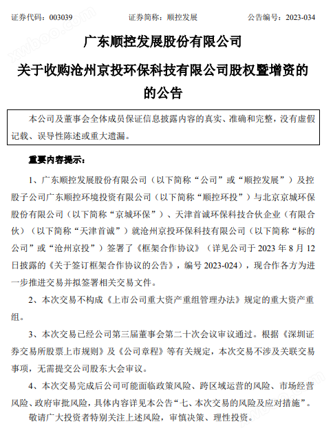 顺控发展关于《关于收购沧州京投环保科技有限公司股权暨增资的公告》显示,广东顺控发展股份有限公司及控股子公司广东顺控环境投资有限公司与北京京城环保 股份有限公司、天津首诚环保科技合伙企业就沧州京投环保科技有限公司签署了《框架合作协议》,现合作各方为进 一步推进交易并拟签署相关交易文件。