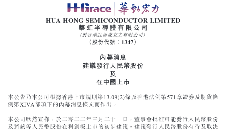 3月21日,华虹半导体在港交所发布公告称,董事会批推可能发行人民币股份及将该人民币股份在科创板上市的初步建议。发行人民币股份的规模将视有关时间的市况而定,根据建议发行人民币股份将予发行的人民币股份不得超过公司经根据建议发行人民币股份拟发行及配发的人民币扩大后的已发行股本25%。