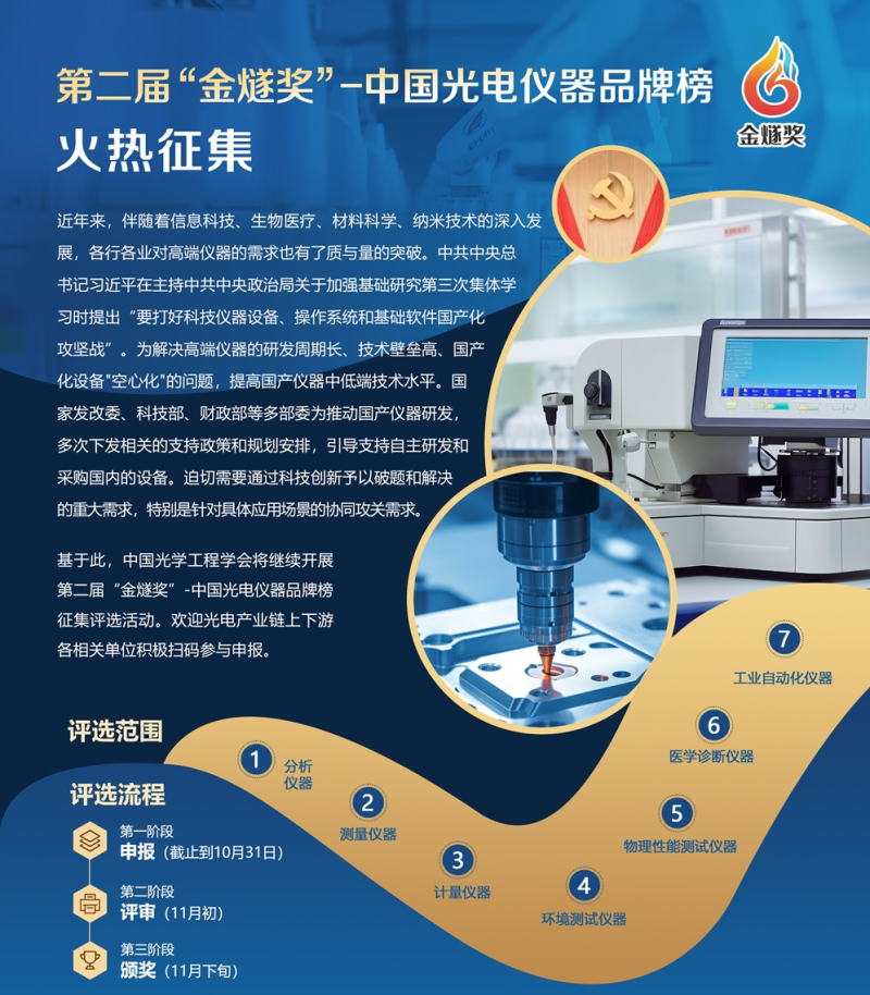 为解决高端仪器的研发周期长、技术壁垒高、国产化设备"空心化"的问题,提高国产仪器中低端技术水平。中国光学工程学会积极响应国家号召,于2022年重磅推出“金燧奖”中国光电仪器品牌榜评选活动。首届活动一经发布,受到了科学仪器行业、国产厂商和仪器用户的高度关注和参与。在成功举办第一届后,学会继续组织开展第二届“金燧奖”中国光电仪器品牌榜评选活动。