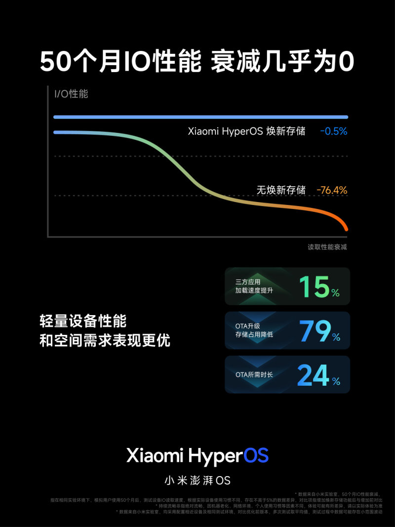 具体来看,小米澎湃 OS 迎来小米史上最大规模「底层重构」,可根据硬件情况灵活配置固件大小,手机固件只有 8.75GB,号称“全行业最小”。